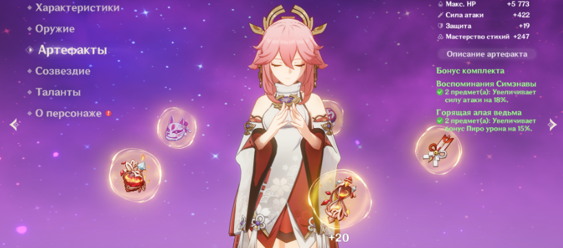 Выбор правильных артефактов для Яэ Мико может значительно увеличить ее эффективность в бою. Вот два основных набора артефактов, которые рекомендуются для Яэ Мико: