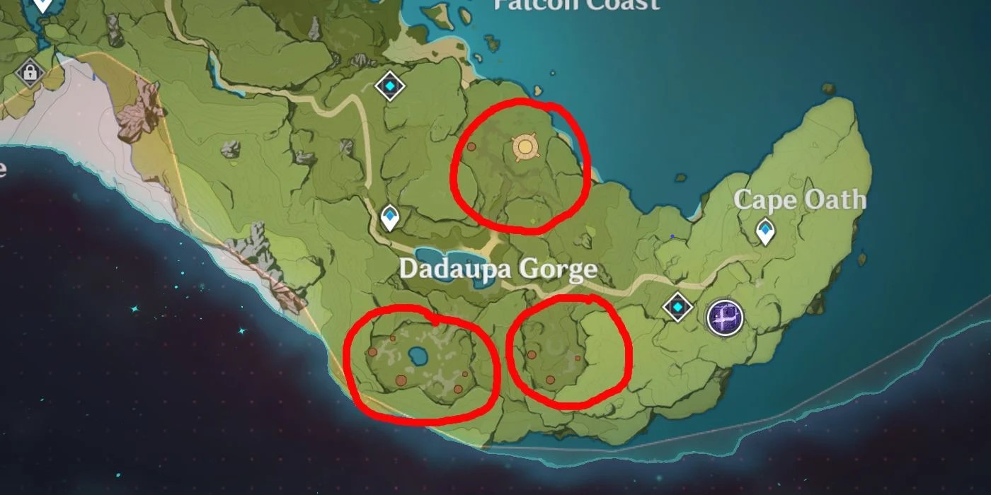 Первоначально никакой метки, как для некоторых других мировых заданий не будет, поэтому чтобы запустить квест “Печать кладбища мечей”, необходимо отправиться в ущелье Дадаупа. Оно находится в западной части области Склон Песни ветра в регионе Мондштадт.